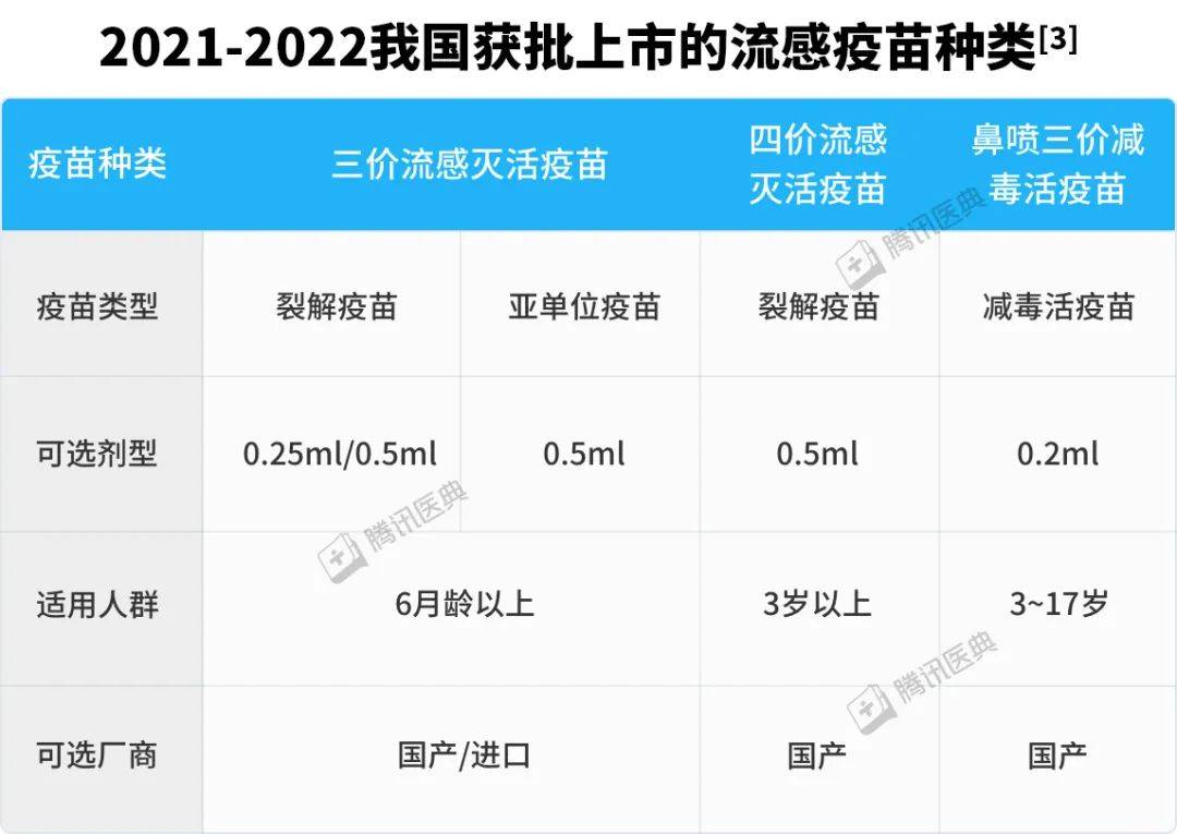 我国2021~2022年批准上市的流感疫苗大体可以分为三类:三价注射灭活流感疫苗(IIV3),四价注射灭活流感疫苗(IIV4),以及三价鼻喷流感减毒活疫苗(LAIV3)。其中,四价流感疫苗比三价疫苗可以多预防乙型流感毒株亚型的流感病毒。